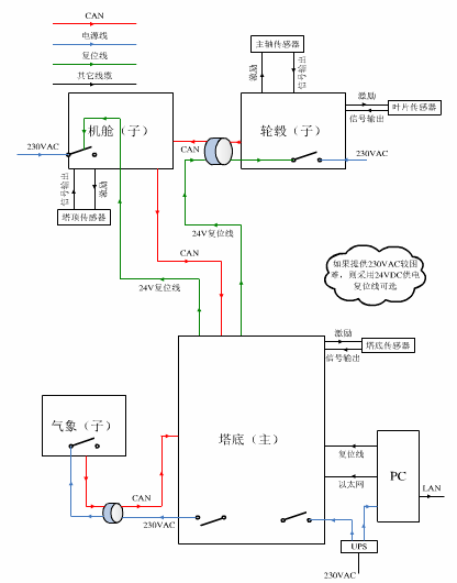 塔底放置的是德維創(chuàng)主數(shù)據(jù)采集系統(tǒng)。它與分布在風機其他部分的子數(shù)據(jù)采集單元采用CAN總線方式通訊。主采集系統(tǒng)的功能包括系統(tǒng)初始化、運行監(jiān)控、將采集數(shù)據(jù)實時存儲、測試數(shù)據(jù)處理等功能。